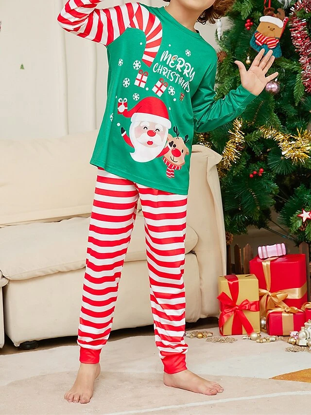 Matching Family Christmas Pajamas Sets Letter Santa Claus Basic Casual Comfort Home Christmas Cotton Breathable Gift Crew Neck Long Sleeve T Shirt Tee Pant Fall Winter Green