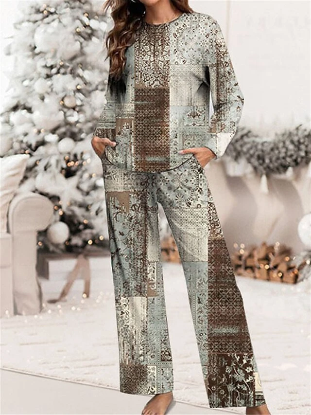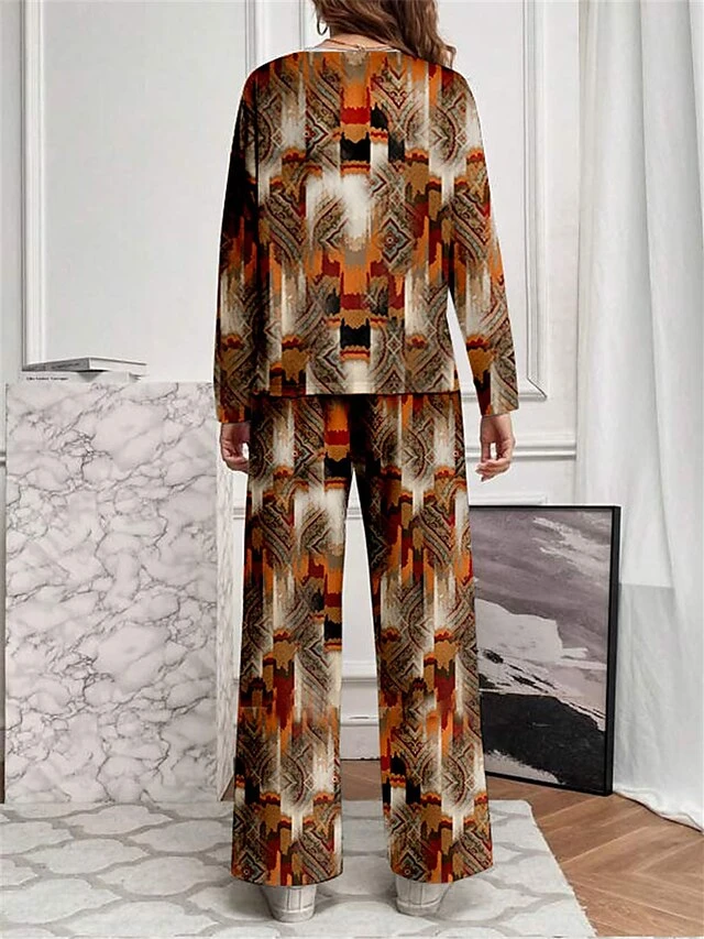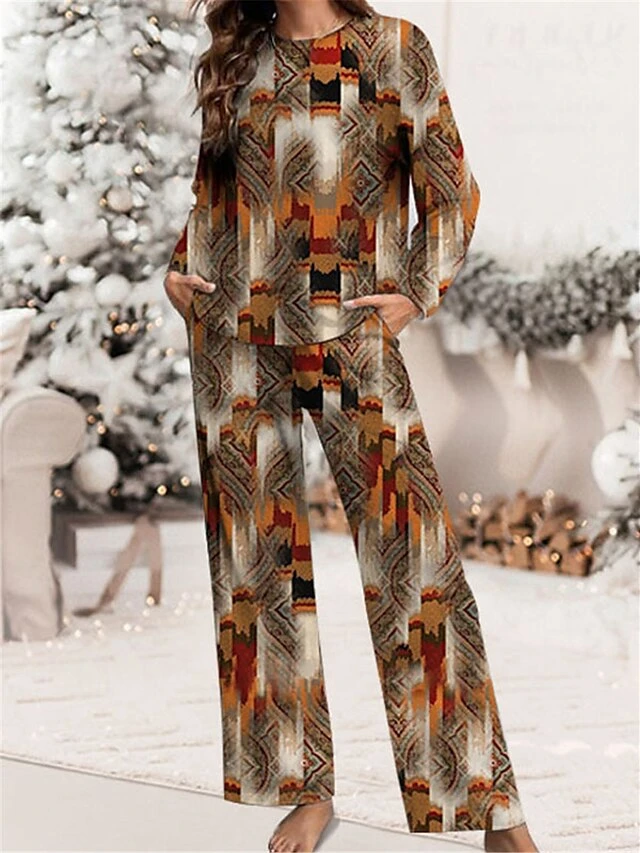Women’s Aztec Pajamas Sets Long Sleeve Geometic Color Combo Warm Retro Comfort Home Daily Polyester Crew Neck Long Sleeve T Shirt Tee Fall Winter Blue Brown