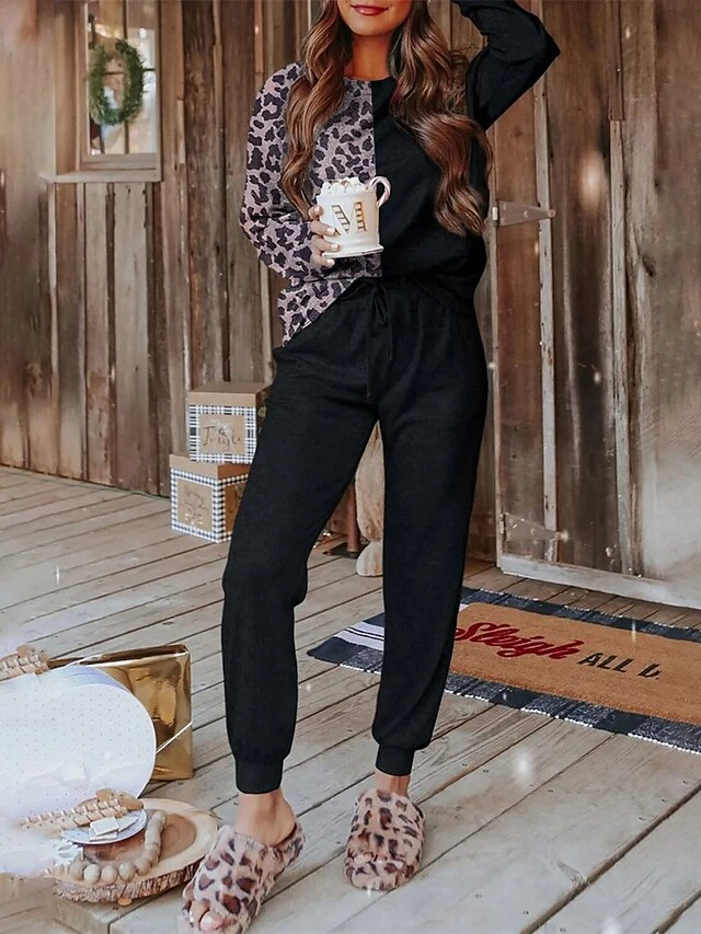 Women’s Christmas Loungewear Sets 2 Pieces Leopard Fashion Casual Comfort Street Xmas Daily Date Polyester Warm Crew Neck Long Sleeve Pant Fall Winter Black