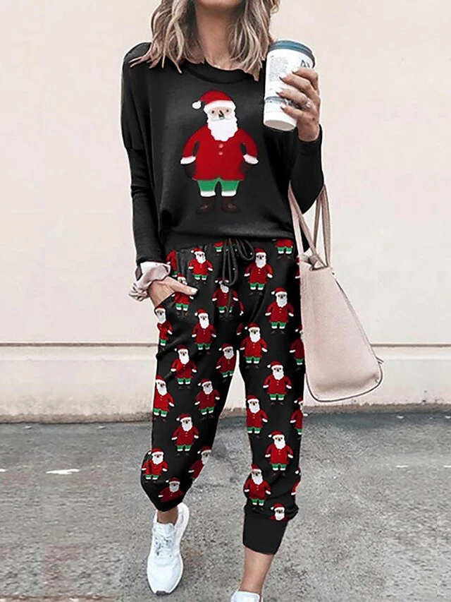 Women’s Christmas Loungewear Sets Santa Claus Elk Sport Casual Comfort Home Xmas Daily Cotton Blend Breathable Lapel Long Sleeve Hoodie Pant Pocket Fall Winter Black White