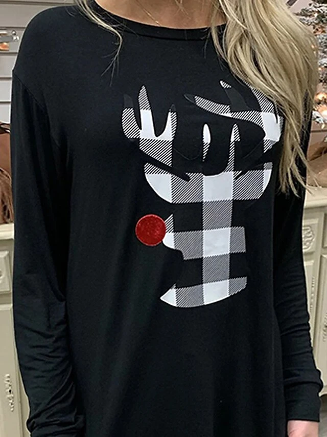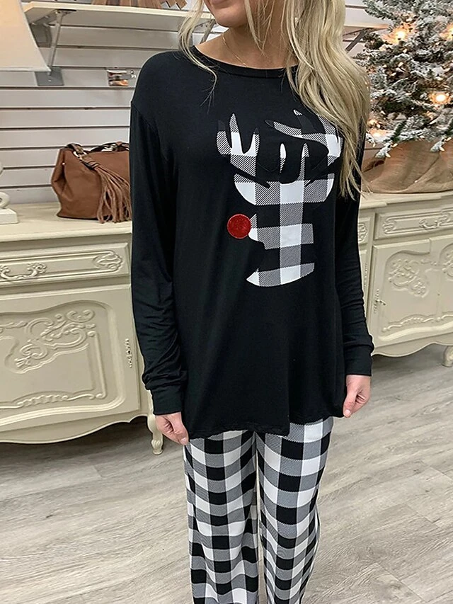 Women’s Christmas Pajamas Loungewear Elk Grid / Plaid Fashion Casual Comfort Home Xmas Daily Polyester Comfort Breathable Crew Neck Long Sleeve Pullover Pant Elastic Waist Fall Winter Black