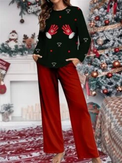 Women’s Christmas Pajamas Sets Heart Warm Comfort Soft Home Christmas Daily Polyester Gift Crew Neck Long Sleeve T Shirt Tee Fall Winter Wine Green