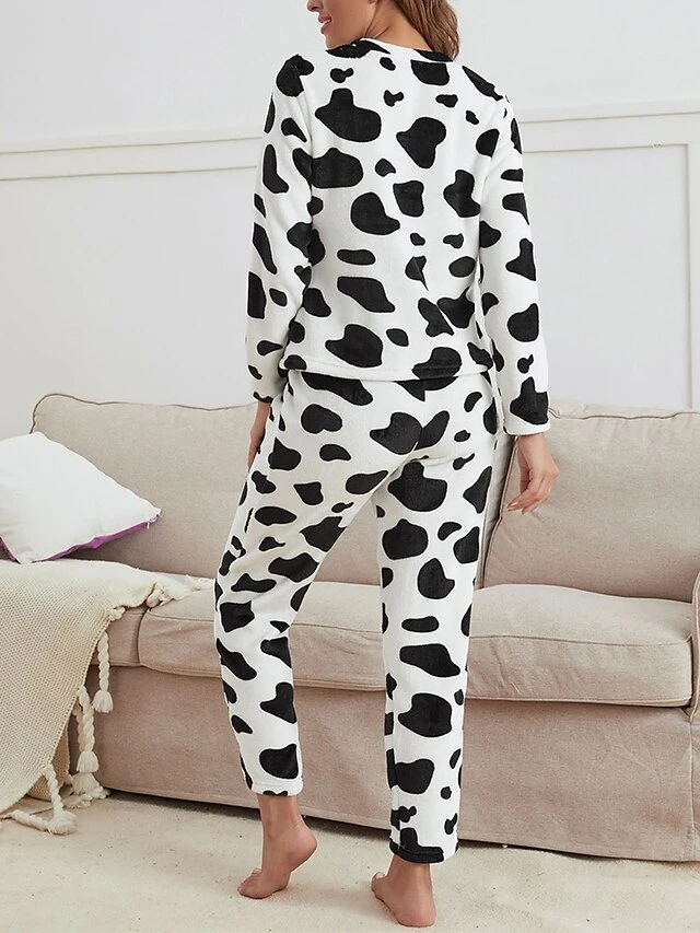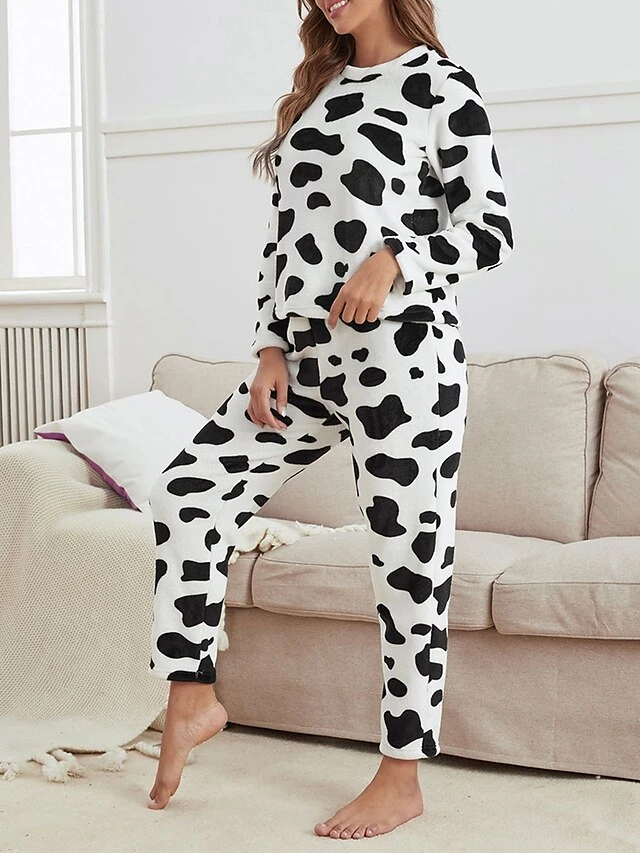 Women’s Fleece Pajamas Sets Milk Cow Warm Fashion Plush Home Daily Bed Flannel Warm Breathable Crew Neck Long Sleeve Pant Fall Winter White