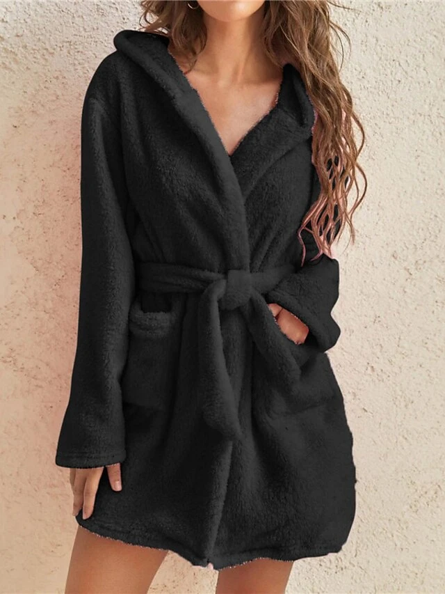 Women’s Fleece Robes Gown Pjs Pure Color Simple Plush Comfort Home Daily Bed Warm V Wire Long Sleeve Pocket Fall Winter Black Gray
