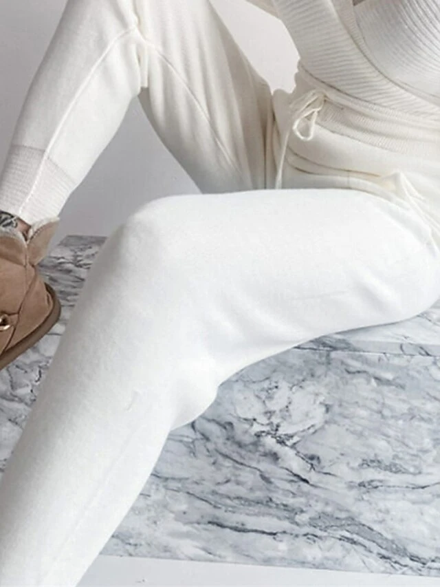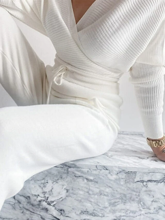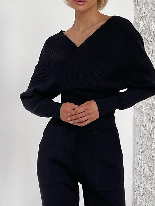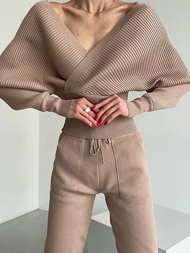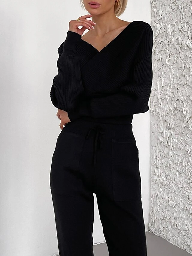 Women’s Knitted Lounge Sets Pure Color Fashion Comfort Soft Street Daily Date Acrylic Breathable V Wire Long Sleeve Pant Summer Fall Black Pink
