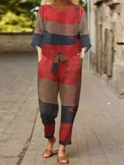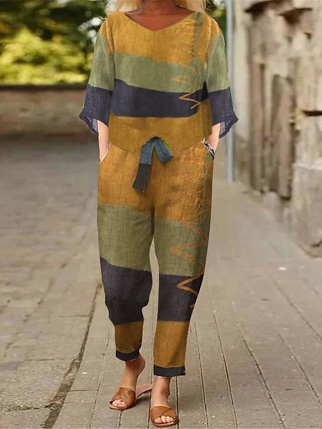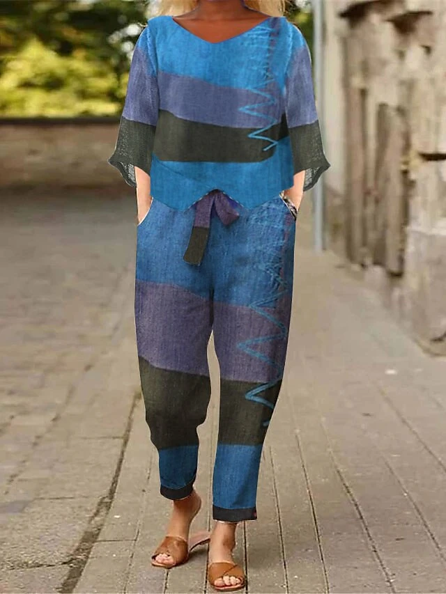Women’s Loungewear Sets 2 Pieces Abstract Flower Casual Comfort Home Street Daily Cotton Blend Breathable Stand Collar Half Sleeve Pullover Pant Pocket Belt Included Summer Spring Lake Blue Red