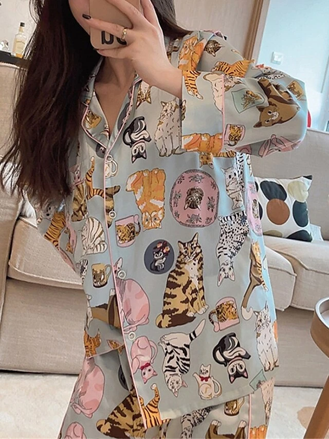 Women’s Loungewear Sets 2 Pieces Cat Fashion Casual Comfort Street Daily Date Polyester Breathable Lapel Long Sleeve Pant Fall Winter Blue