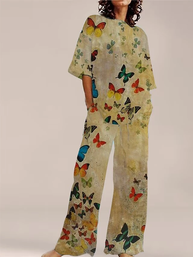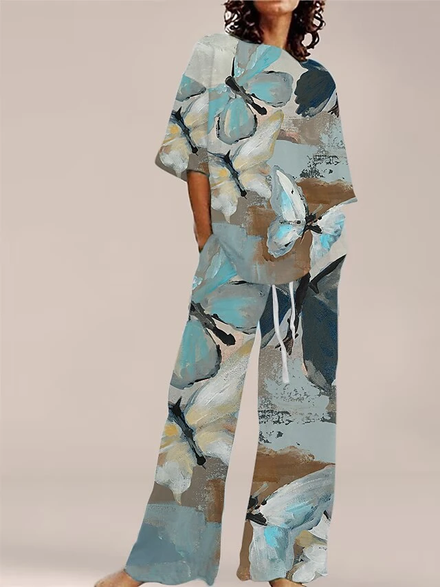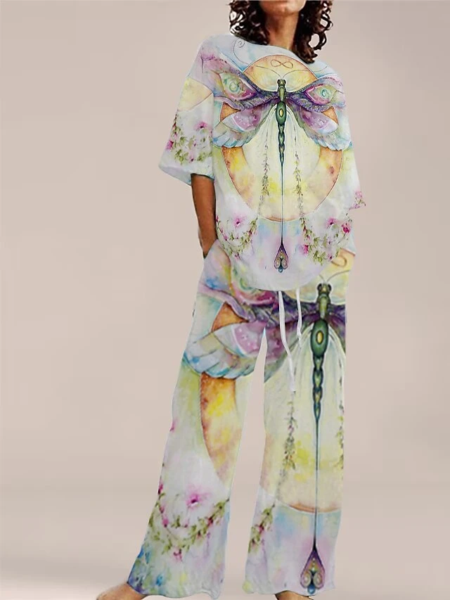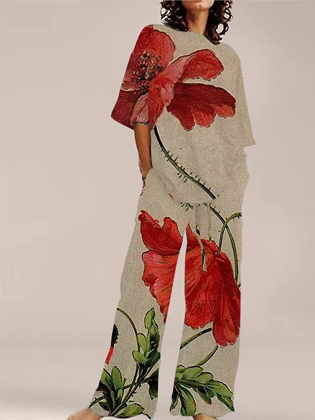 Women’s Loungewear Sets 2 Pieces Flower Simple Comfort Sweet Home Daily Polyester Breathable Crew Neck Short Sleeve Pullover Pant Pocket Summer Spring Yellow Red