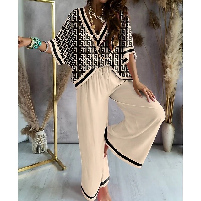 Women’s Loungewear Sets 2 Pieces Grid / Plaid Comfort Sweet Home Daily Polyester V Wire Half Sleeve T Shirt Tee Pant Spring Fall Beige