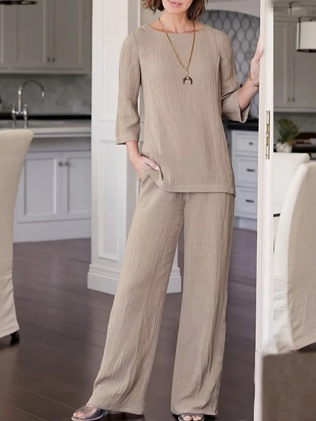 Women’s Loungewear Sets 2 Pieces Pure Color Casual Comfort Home Daily Polyester Breathable Crew Neck Half Sleeve Shirt And Wide Leg Pants Summer Spring Navy Blue Khaki