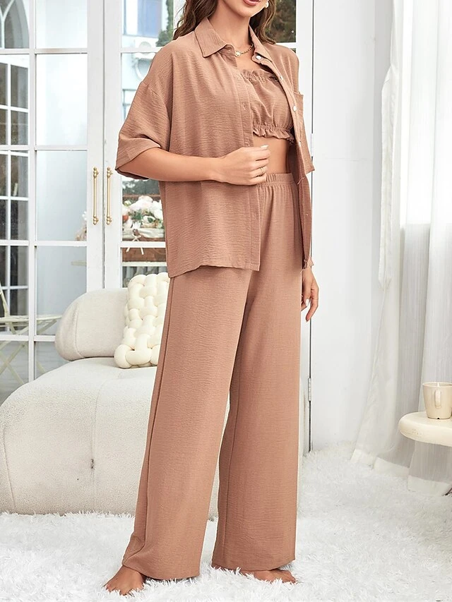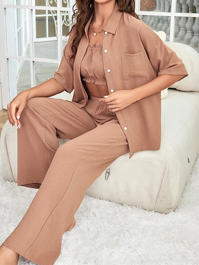 Women’s Loungewear Sets 3 Pieces Pure Color Fashion Comfort Soft Home Daily Bed Polyester Breathable Lapel Long Sleeve Shirt Pant Button Pocket Fall Winter Lotus Pink