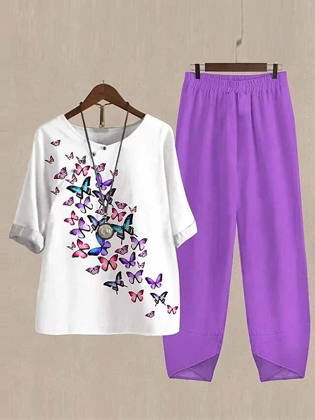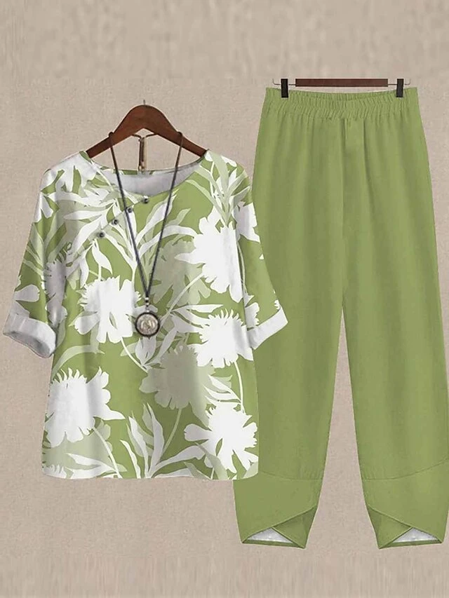 Women’s Loungewear Sets Grid / Plaid Flower Fashion Casual Street Date Airport Polyester Breathable Crew Neck Half Sleeve T Shirt Tee Pant Summer Spring Light Green Pink