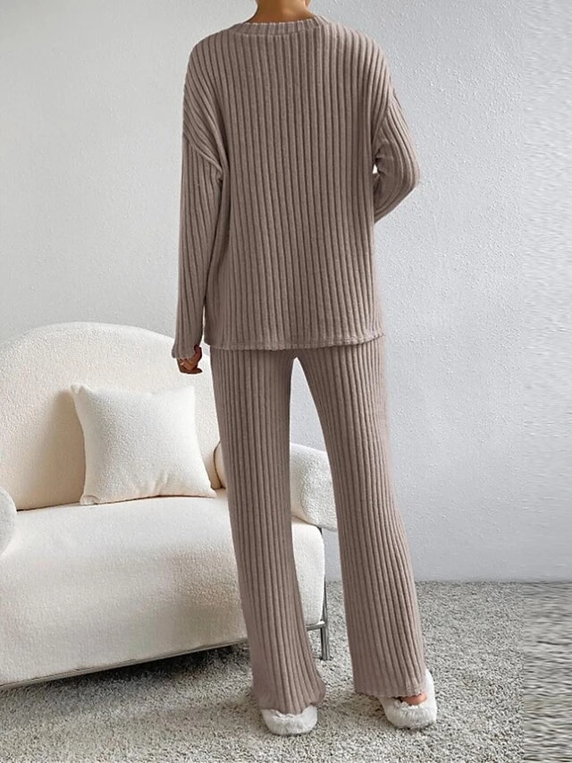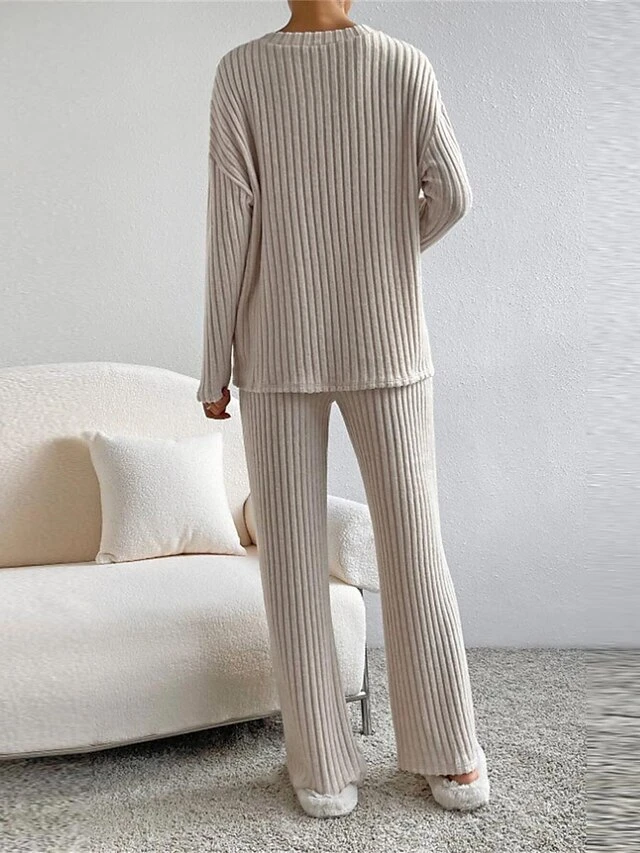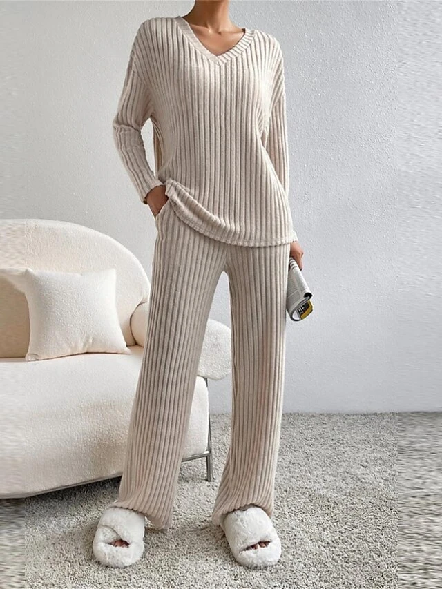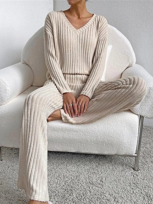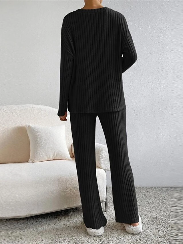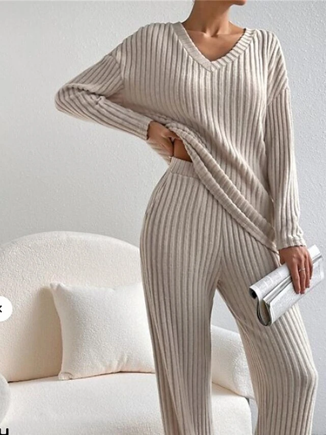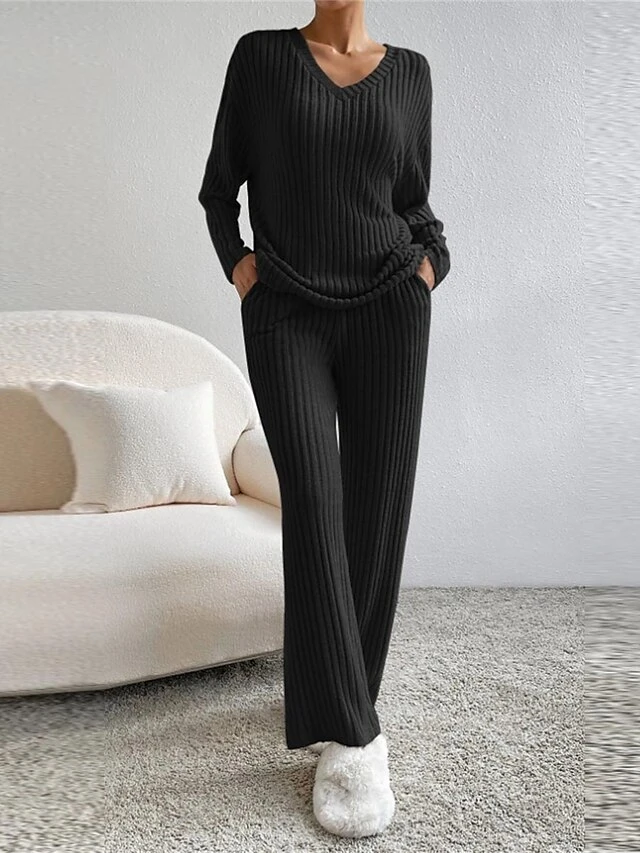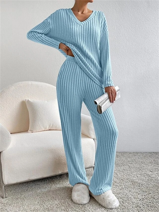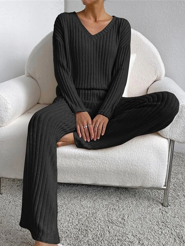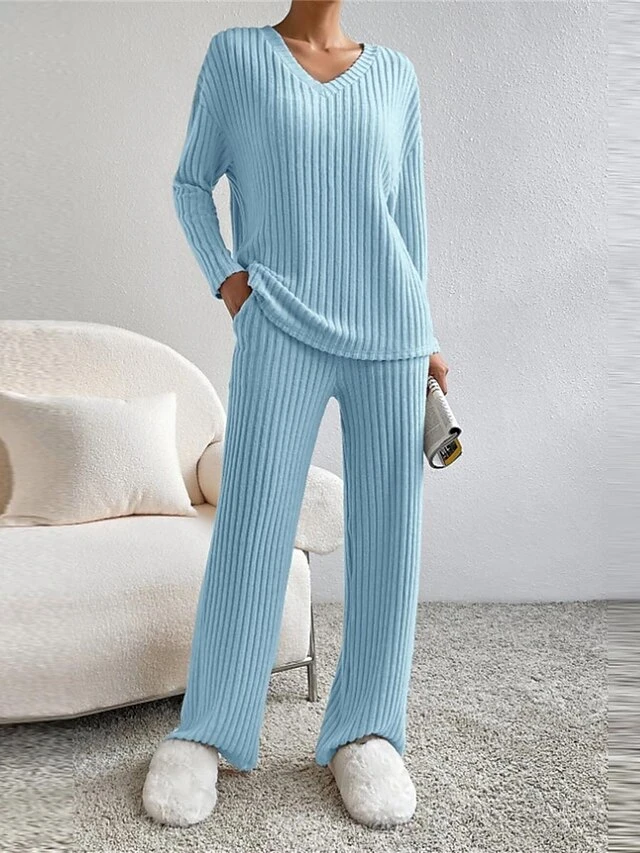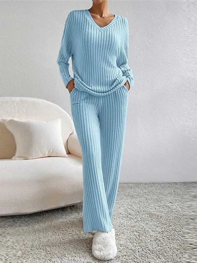 Women’s Loungewear Sets Knit Drop Shoulder Tee Sweater And Pants Pure Color Home Street Daily Polyester Breathable V Wire Long Sleeve Sweater Pant Pocket Fall Winter Black Blue