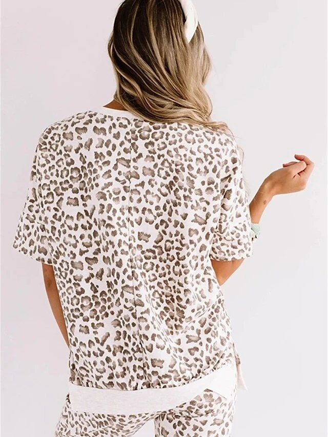 Women’s Loungewear Sets Leopard Casual Comfort Soft Home Daily Vacation Polyester Breathable Crew Neck Short Sleeve Pant Elastic Waist Fall Spring Brown Gray