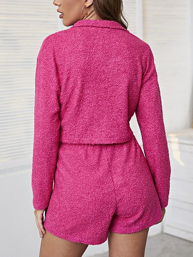 Women’s Loungewear Sets Pure Color Fashion Comfort Soft Home Daily Bed Polyester Breathable Lapel Short Sleeve Pullover Shorts Fall Winter Magenta