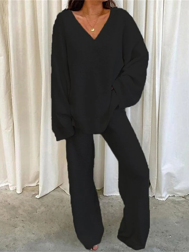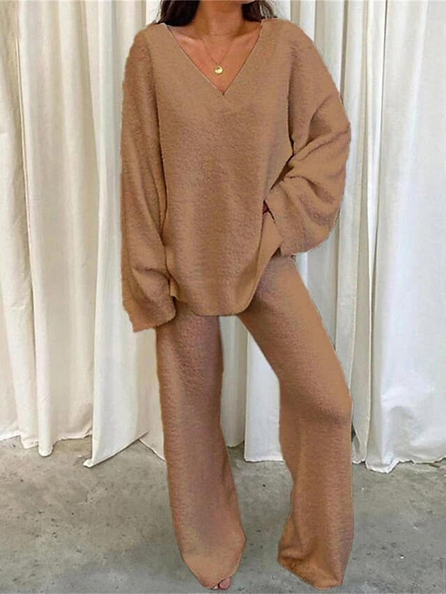 Women’s Loungewear Sets Pure Color Plush Casual Comfort Home Street Daily Sherpa Warm Breathable V Wire Long Sleeve Pant Fall Winter Black White