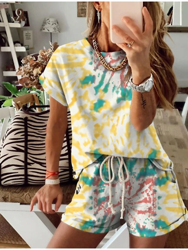 Women’s Loungewear Sets Tie Dye Sport Casual Comfort Home Street Daily Cotton Breathable Crew Neck Short Sleeve T Shirt Tee Shorts Pocket Summer Spring White Yellow