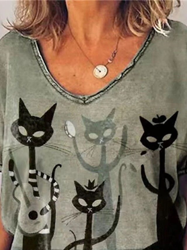 Women’s Loungewear Top Cat Fashion Casual Comfort Street Date Airport Spandex Breathable Lapel Short Sleeve Summer Spring Gray