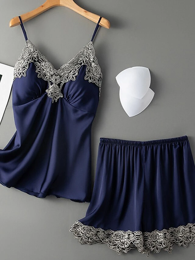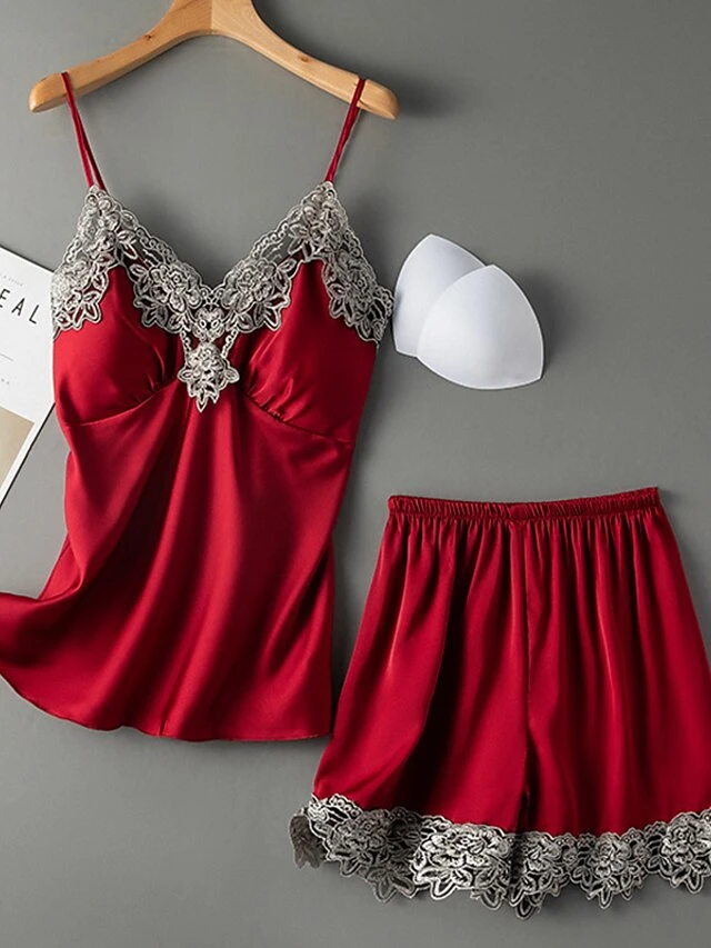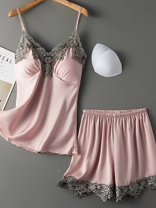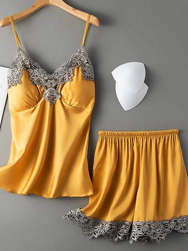 Women’s Pajama Satin Top And Pant Sets 2Pcs Pure Color Fashion Casual Soft Home Daily BedBreathable Straps Sleeveless Strap Top Shorts Chest Pads Removable Pad Summer Spring Lotus Pink Yellow
