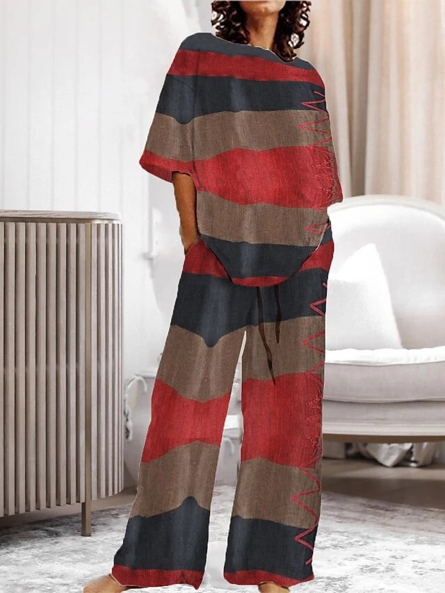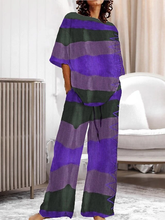 Women’s Pajama Top And Pant Stripe Comfort Home Daily Polyester Crew Neck Summer Spring Yellow Pink