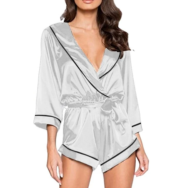 Women’s Pajamas Onesies Jumpsuits Nighty 1 PCS Stripes Pure Color Comfort Sweet Party Home Bed Satin Gift Plunging Neck Long Sleeve Basic Fall Spring Pink Navy Blue / Silk