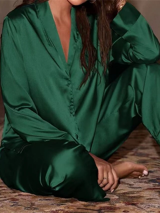 Women’s Pajamas Pajama Top And Pant Sets 2 Pieces Pure Color Fashion Casual Soft Home Daily Bed Polyester Breathable Lapel Long Sleeve Pant Button Summer Fall Black Champagne