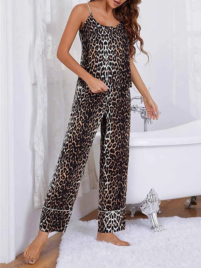 Women’s Pajamas Pajama Top And Pant Sets Leopard Fashion Casual Soft Home Daily Bed Rayon Breathable Straps Sleeveless Strap Top Pant Summer Spring Brown