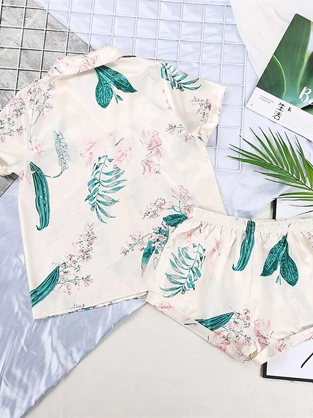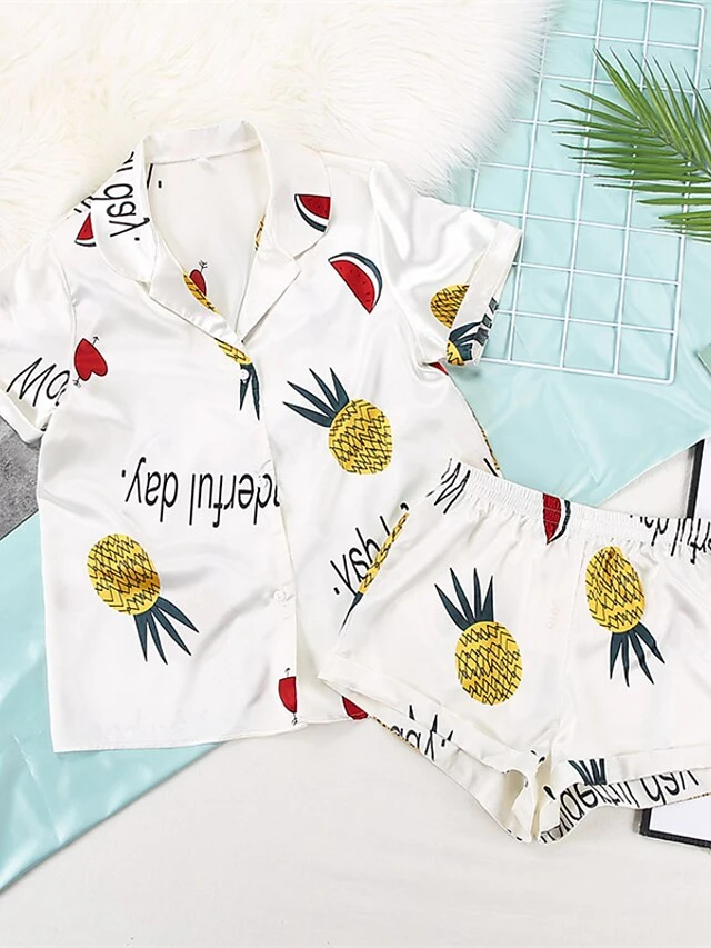 Women’s Pajamas Pajama Top And Pant Sets Letter Fruit Simple Casual Comfort Home Daily Bed Satin Breathable Lapel Short Sleeve Shirt Shorts Button Spring Summer Light Pink White