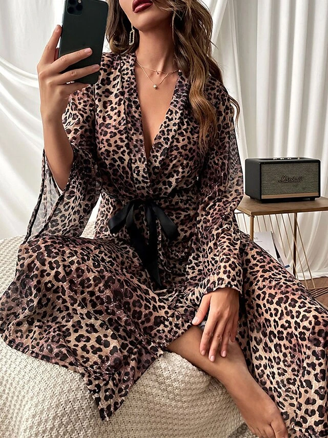 Women’s Pajamas Robe Bathrobe Leopard Simple Casual Comfort Home Daily Spa Spandex Breathable V Wire Long Sleeve Fall Winter Brown