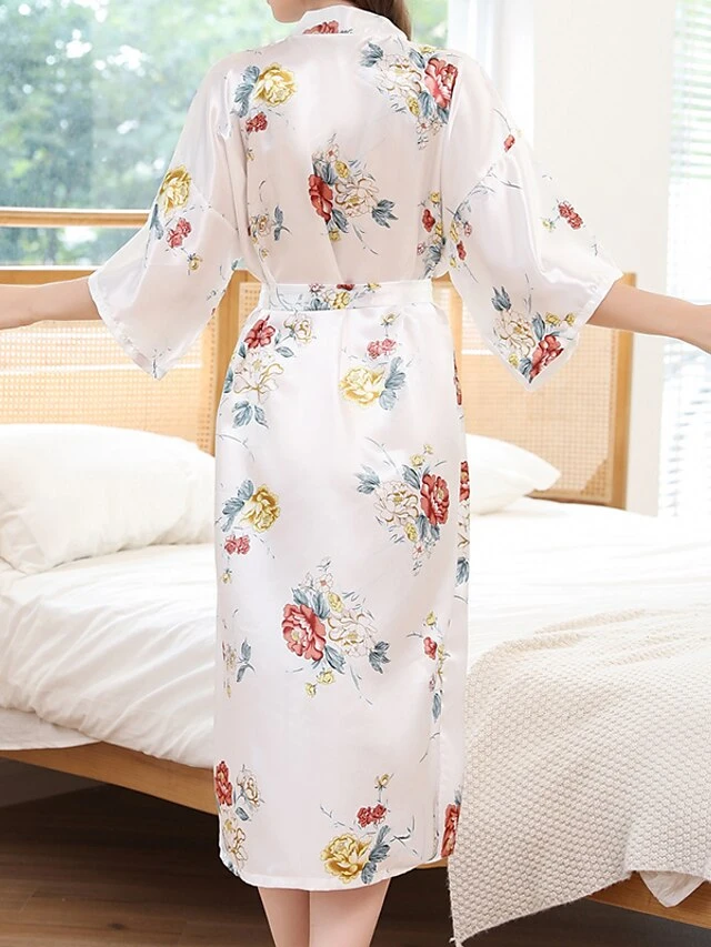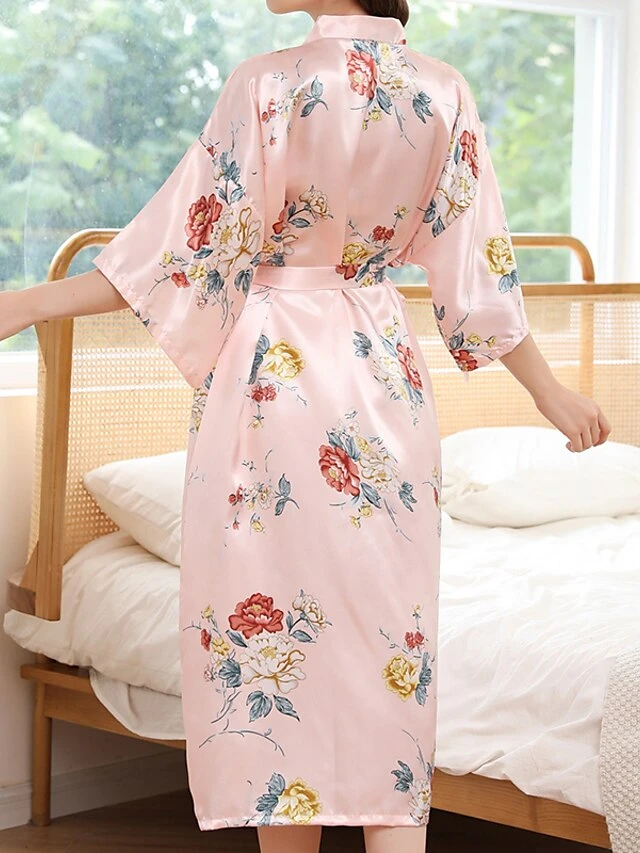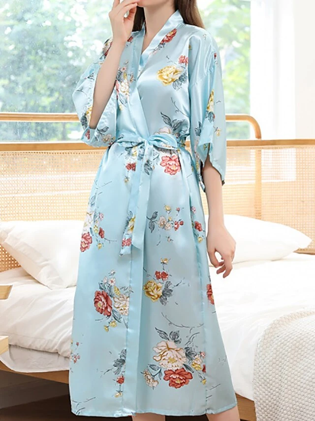 Women’s Pajamas Robes Gown Bathrobes Nighty 1 PCS Flower Simple Comfort Kimono Robes Home Wedding Party Spa Satin Gift Long Sleeve Print Belt Included Spring Summer Blue Pink