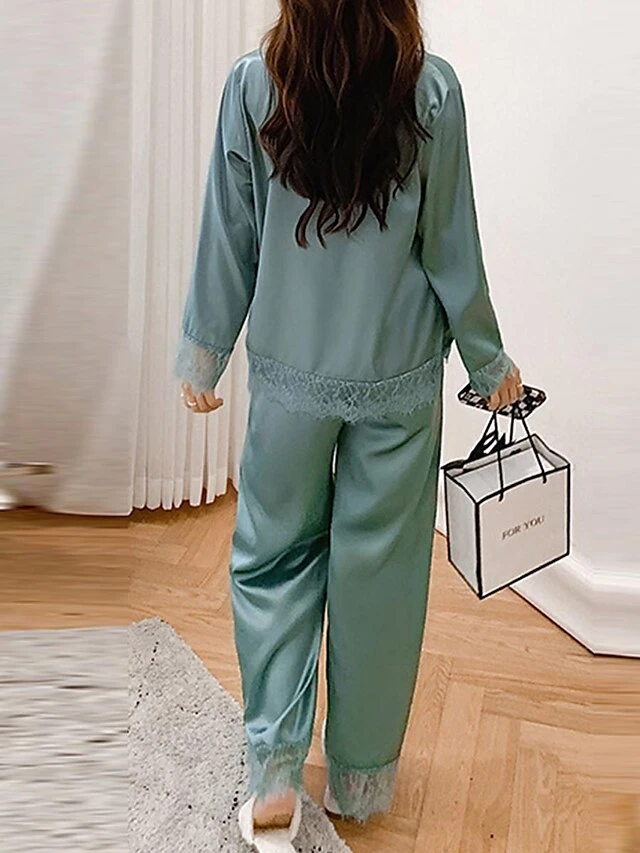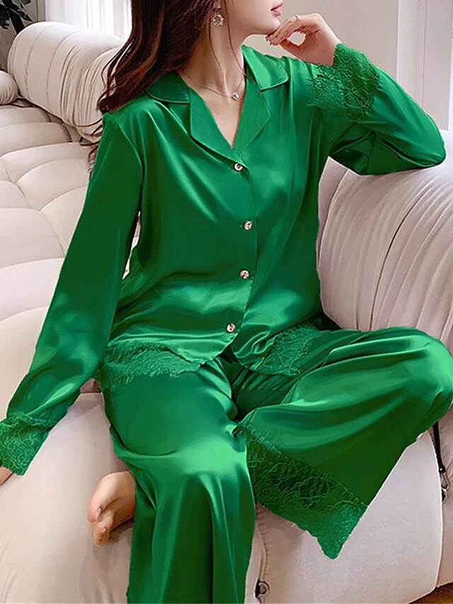 Women’s Pajamas Sets Pure Color Casual Comfort Soft Home Daily Bed Satin Breathable Lapel Long Sleeve Shirt Pant Button Summer Fall Light Green Pink