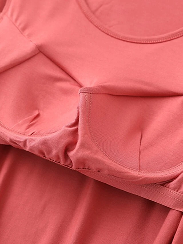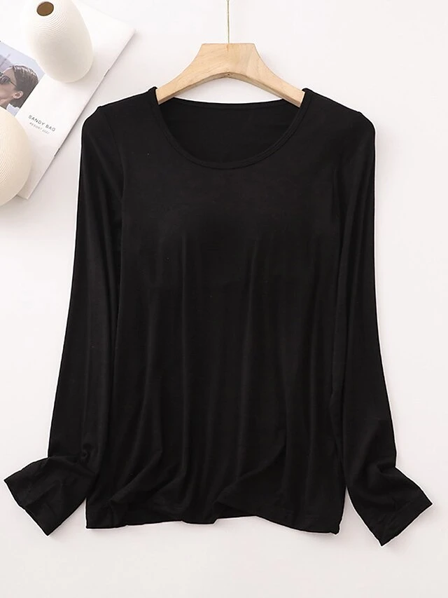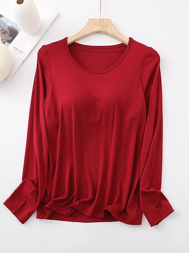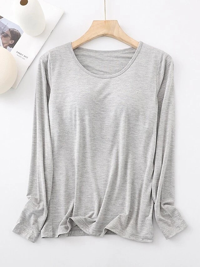 Women’s Pajamas Top Pure Color Simple Casual Soft Home Daily Bed Cotton Breathable Crew Neck Long Sleeve Chest Pads Fall Winter Sauce Purple Champagne Powder