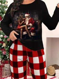Women’s Plus Size Christmas Pajamas Sets Santa Claus Grid / Plaid Warm Comfort Soft Home Christmas Daily Polyester Gift Crew Neck Long Sleeve T Shirt Tee Fall Winter Black White