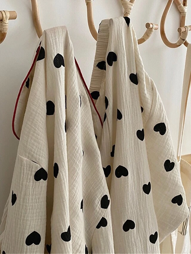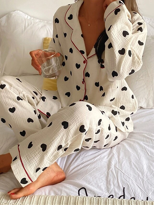Women’s Plus Size Heart Print Pajama Sets Simple Casual Comfort Home Daily Bed Polyester Breathable Lapel Long Sleeve Shirt Pant Button Summer Fall White