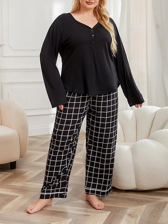 Women’s Plus Size Loungewear Sets Grid / Plaid Fashion Comfort Soft Home Daily Bed Polyester Breathable V Wire Long Sleeve Pullover Pant Fall Winter 21047M-Black