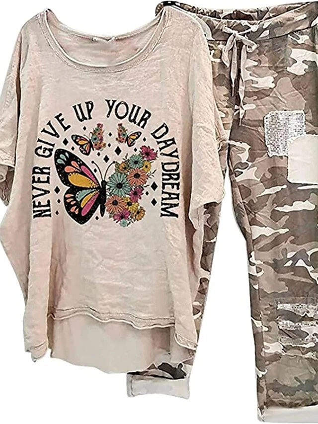 Women’s Plus Size Pajamas Pajama Top And Pant Sets 2 Pieces Butterfly Letter Fashion Casual Soft Home Daily Bed Polyester Breathable Crew Neck Long Sleeve Pant Elastic Waist Summer Spring Black White