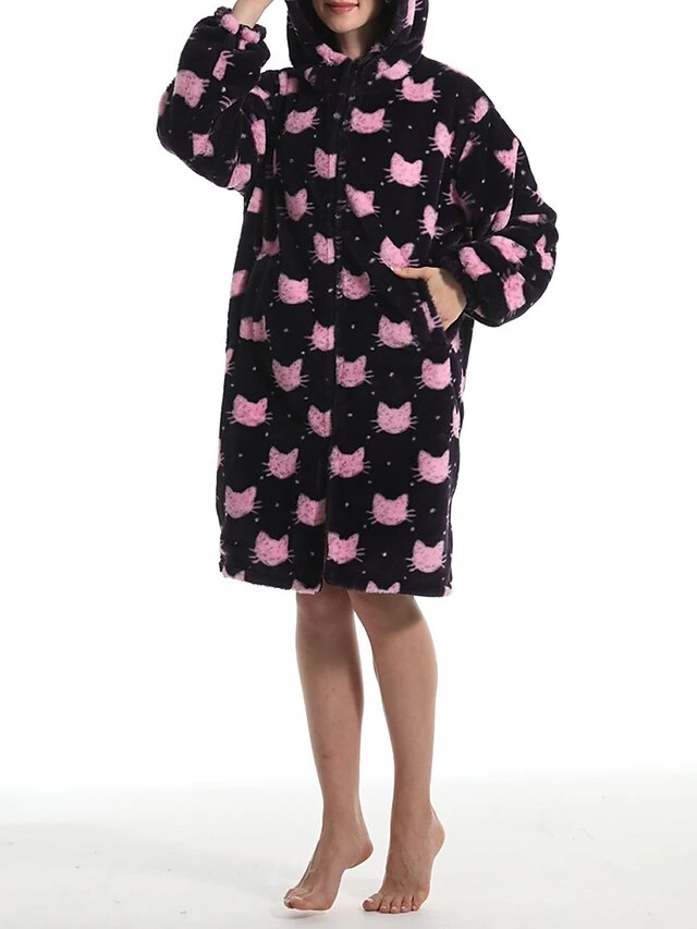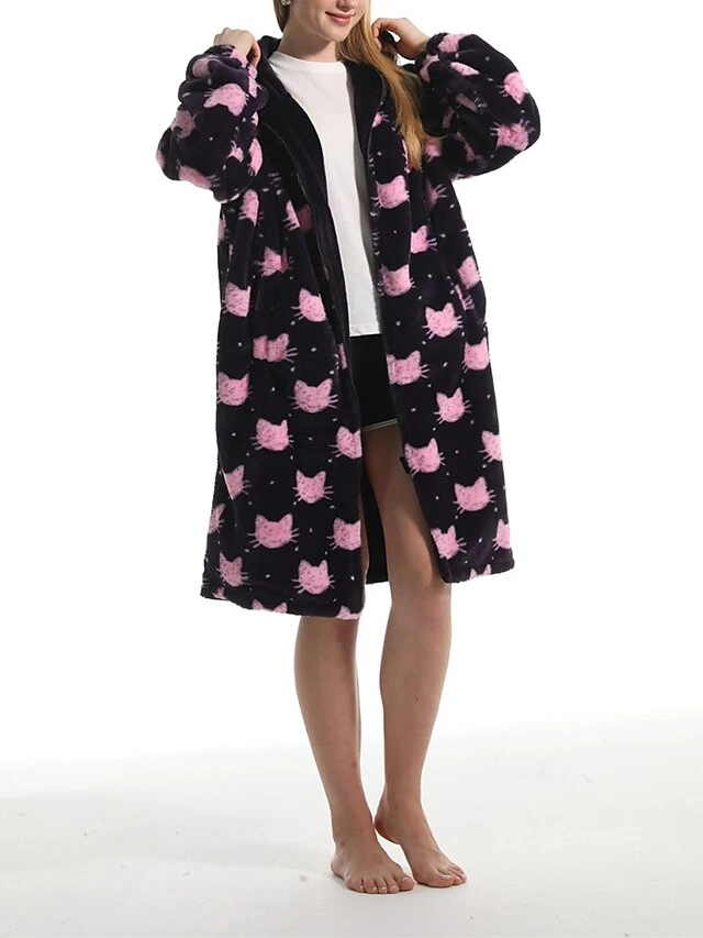 Women’s Robe Cat Plush Casual Comfort Home Daily Bed Flannel Warm Breathable Hoodie Long Sleeve Pocket Fall Winter Pink
