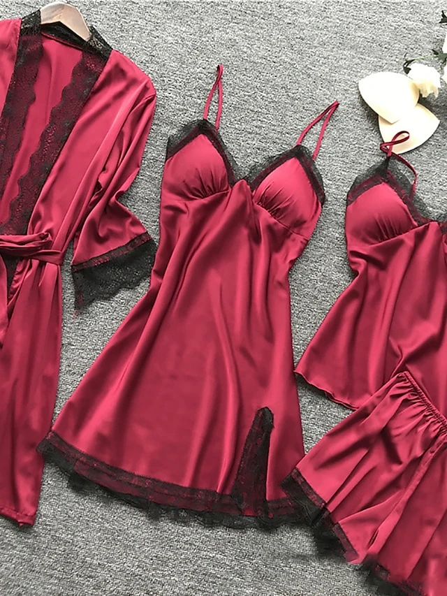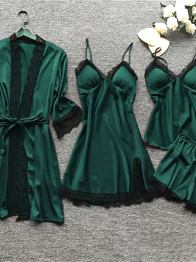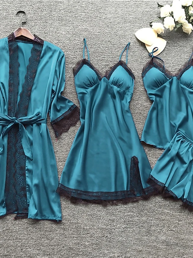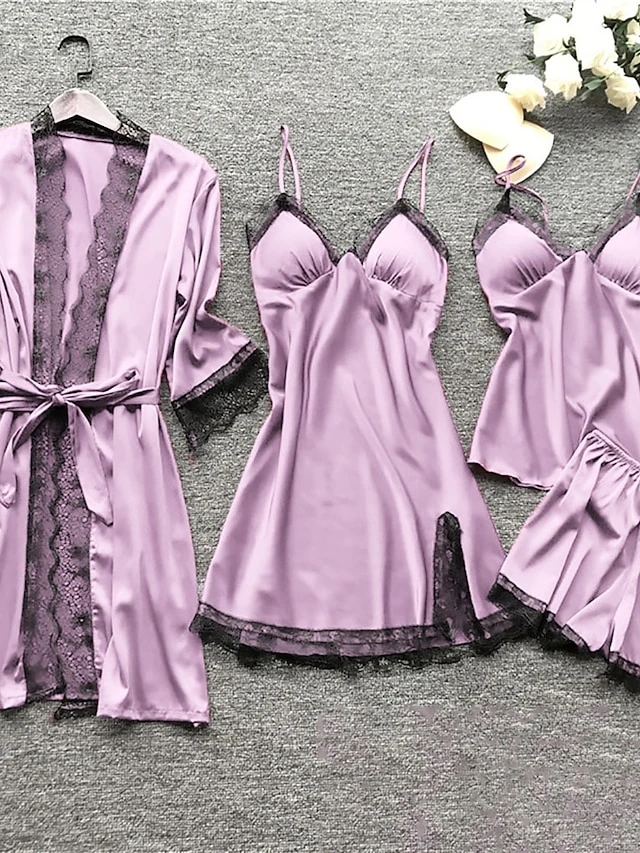 Women’s Satin Silk Pajamas Sets 4 Pieces Pure Color Simple Casual Soft Home Daily Bed Satin Breathable V Wire Long Sleeve Robe Top Shorts Elastic Waist Summer Spring Black Champagne
