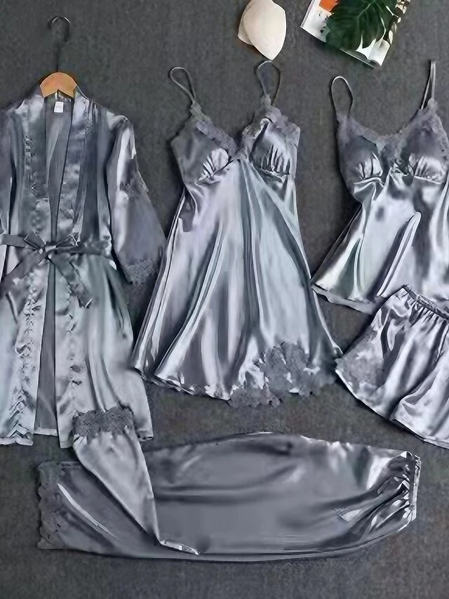 Women’s Satin Silk Sexy Lingerie Sets 5 Pieces Heart Stripe Casual Comfort Soft Home Daily Bed Satin Breathable V Wire Long Sleeve Pant Pocket Elastic Waist Summer Spring Black Pink
