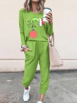 Women’s Sets 2 Pieces Cartoon Monster Comfort Funny Home Christmas Polyester Breathable Crew Neck Long Sleeve Pullover Pant Pocket Fall Winter Light Green Wine