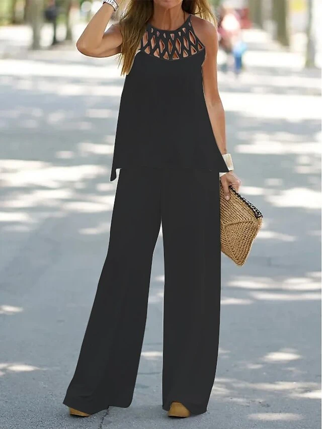 Women’s Sets 2 Pieces Flower Comfort Home Cotton Blend Comfort Halter Sleeveless Hole Summer Spring Lake Blue Black