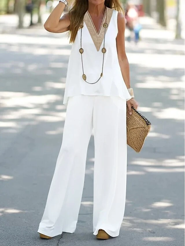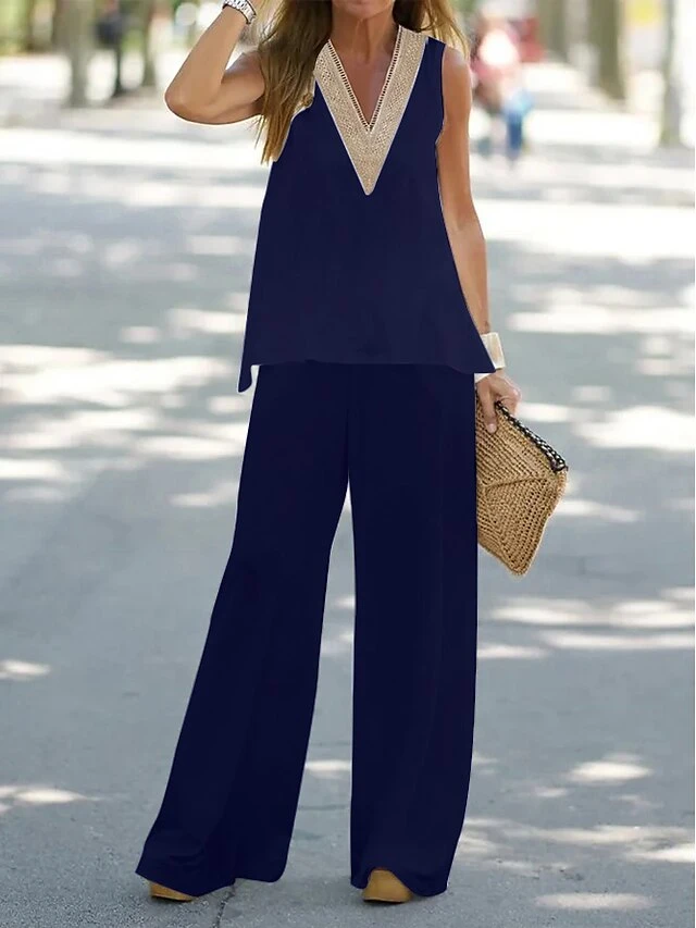 Women’s Sets 2 Pieces Pure Color Comfort Home Daily Cotton Blend Comfort V Wire Sleeveless Summer Spring Lake Blue Black