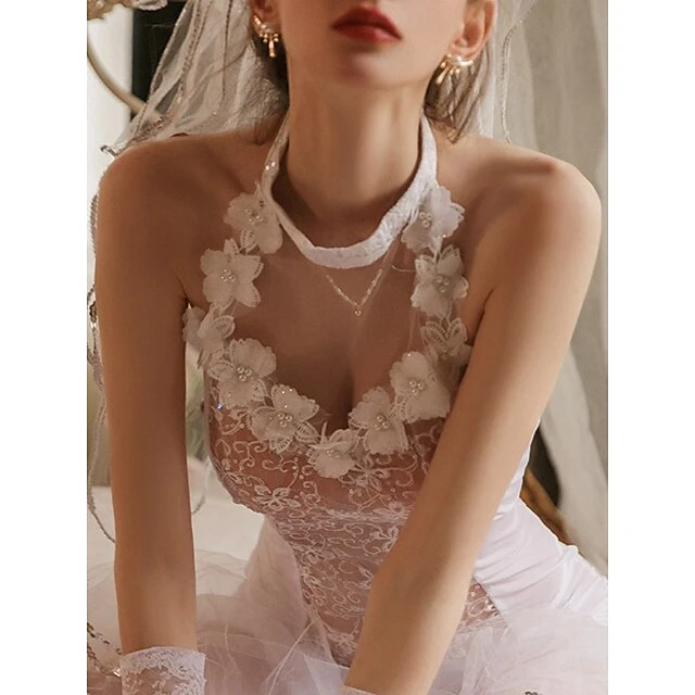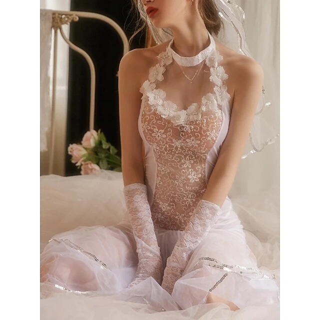 Women’s Sexy Bodies Nightgown Pure Color Lovers Hot Comfort Home Bed Valentine’s Day Mesh Breathable Halter Neck Long Sleeve Backless Transparent Summer Spring White