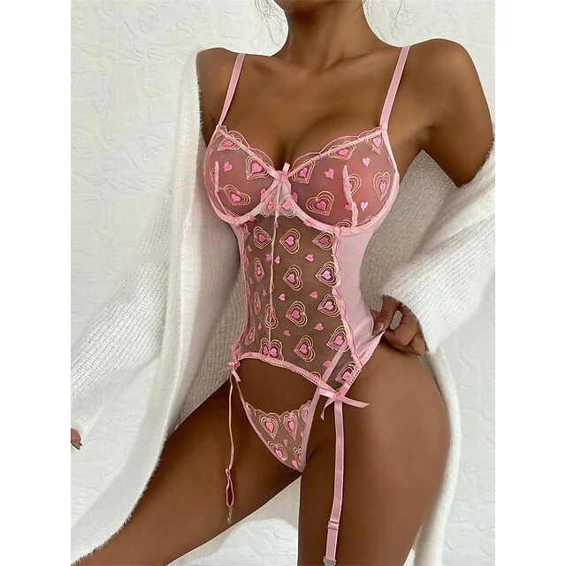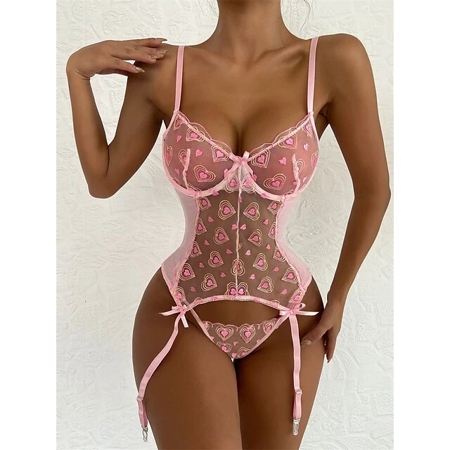 Women’s Sexy Bodies Sets Heart Lovers Hot See Through Home Bed Valentine’s Day Polyester Breathable Straps Sleeveless Backless Embroidery Summer Spring Pink